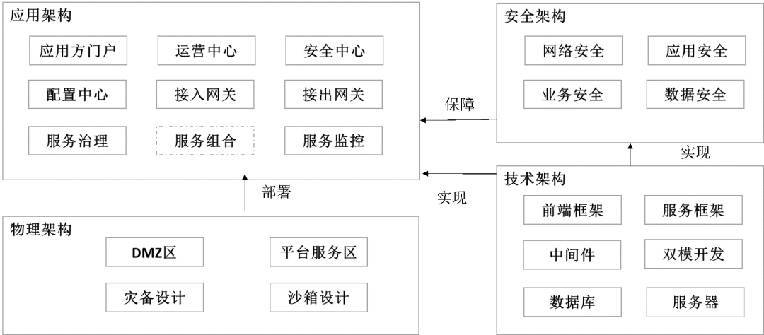 开放平台的架构体系包含应用架构、技术架构、物理架构和安全架构,其关系如图所示。