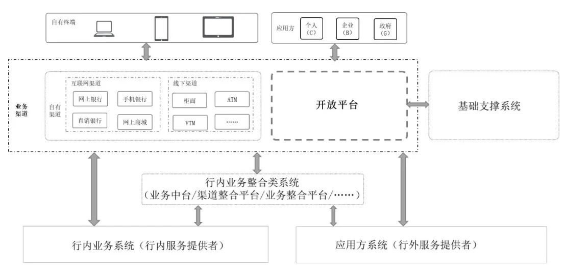 ——开放平台与银行自有渠道:二者共同构成银行主要的业务渠道,但分工不同,开放平台实现应用方的接入,自有渠道实现银行自有终端的接入;