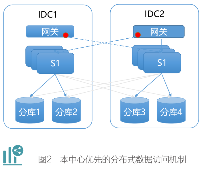 将 4 个分库平均分到同城的两个中心, 假 设 分 库 1、2 在 IDC1, 分 库 3、 4 在 IDC2,当隶属于分库 1 中的账户从 IDC1 中的微服务实例中发起交易请求,其内部将请求快速路由到本中心的分库 1 中进行 SQL 处理,但如果该交易请求从 IDC2 中的微服务实例中发起,则需要跨数据库中心去访问 IDC1 中的分库1,这样就会造成额外的跨数据中心的网络开销。如果该交易中只有 1~2 条 SQL影响也不大,但如果该交易中包括 20 条SQL,每一条都涉及跨数据中心的访问,则累计的网络开销就有1ms×20,约有20ms 的额外损耗,再按照概率大致计算,基本有50% 的交易面临这种可能,整体对核心业务系统的性能影响比较明显。但上述问题其实只需在技术层面做一点增强就可以解决:在服务执行之前先判断一下其操作的数据是在哪个分片,然后再将其转发到正确的IDC 即可,如图2所示,红色部分可以理解为前面提到的跨中心路由功能。同样假设上述从 IDC2 进来的交易请求访问的是分库 1 中的数据,则通过简单的计算,发现其要操作的数据在 IDC1 中,则将该请求直接转发到 IDC1即可,后续所有操作都在 IDC1 内部完成。这样问题就解决了,并且对跨多个分片的数据查询及转账等业务场景,其固有的优势还可以保留,相比单元化的方式要简单很多。