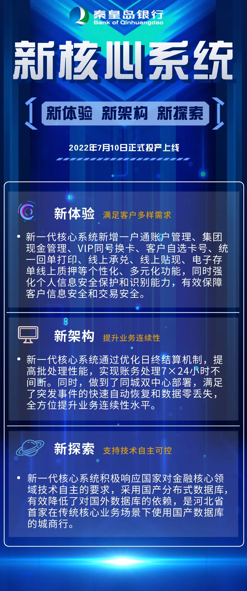 新体验,新构架,新探索。7月10日,秦皇岛银行新一代核心系统成功投产上线,标志着秦皇岛银行数字化金融应用能力和服务水平登上了一个新的台阶。