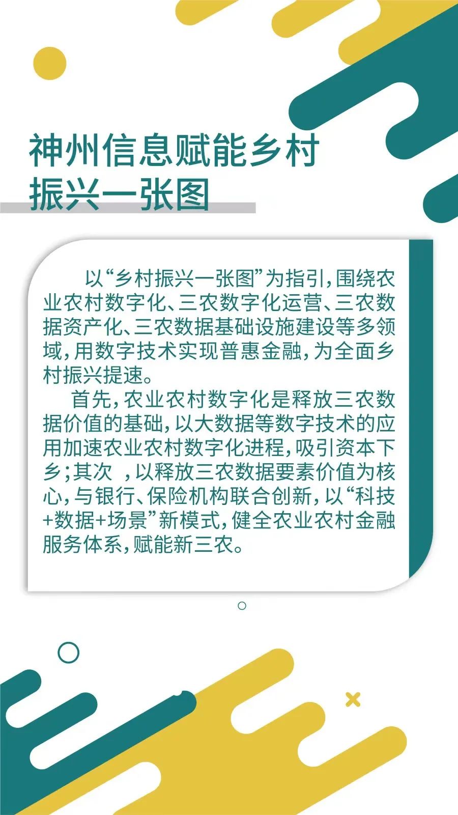 以“乡村振兴一张图”为指引,围绕农业农村数字化、三农数字化运营、三农数据资产化、三农数据基础设施建设等多领域进行大量创新及实践,践行用数字技术实现普惠金融的使命,为全面乡村振兴提速。